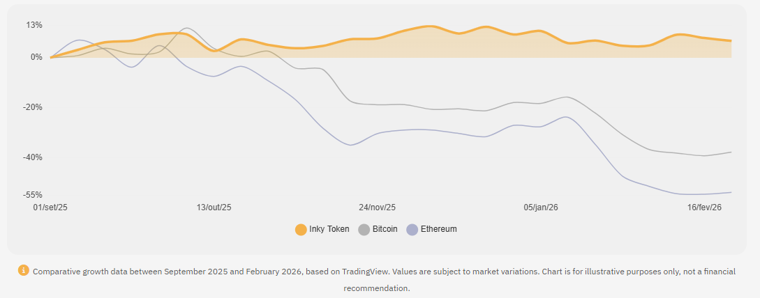 Essa diferença sugere que, enquanto os principais criptoativos passaram por uma fase de correção associada ao ciclo macroeconômico e à contração de liquidez, o Inky Token demonstrou resiliência relativa no mesmo contexto de mercado.
